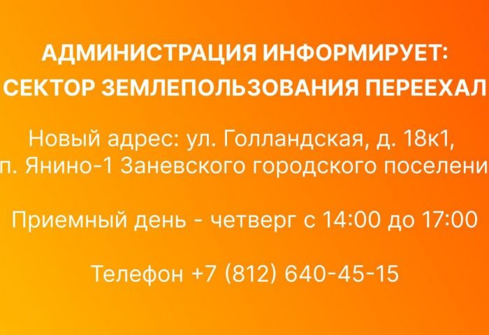Уведомляем, что специалисты сектора землепользования и природопользования администрации Заневского городского поселения переехали на новый адрес: гп. Янино-1, ул. Голландская, д. 18к1