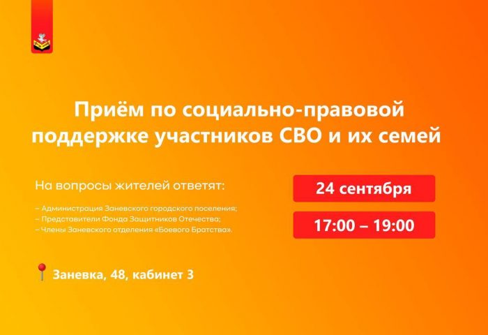 Администрация Заневского городского поселения совместно с представителями Фонда Защитников Отечества и местного отделения «Боевого Братства» примут жителей муниципалитета 24 сентября с 17:00 до 19:00