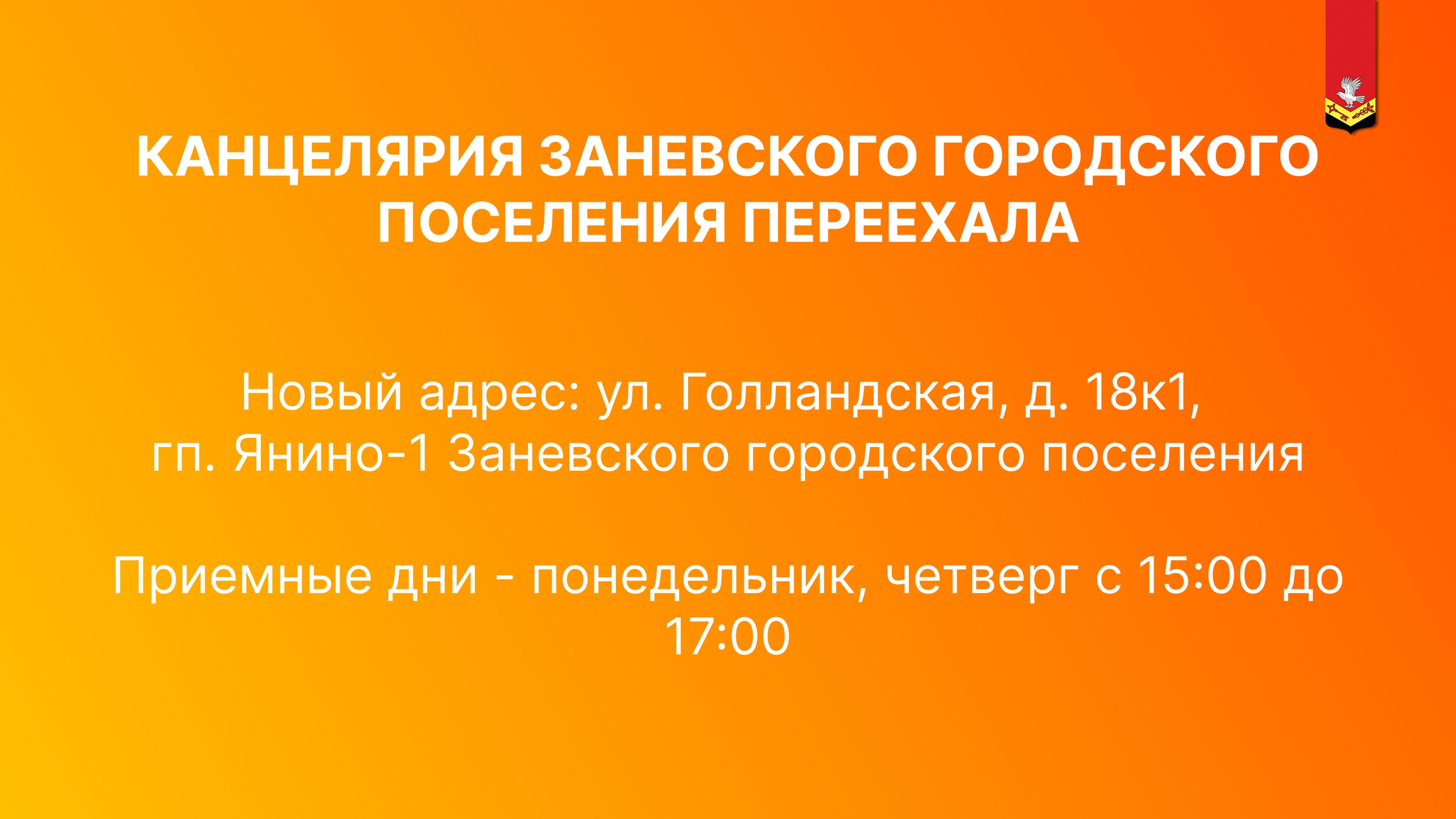 14 Октябрь Канцелярия переехала Новости Уважаемые жители! Уведомляем, что канцелярия администрации Заневского городского поселения переехала на новый адрес: гп. Янино-1, ул. Голландская, д. 18к1. Прием обращений в д. Заневка, д. 48 больше не ведется. Кол-во просмотров: 14