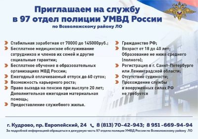 Коллектив 97-го отдела полиции в Кудрово приглашает в команду мужчин в возрасте до 40 лет и благодарит всех, кто поддерживает местные вакансии репостом.