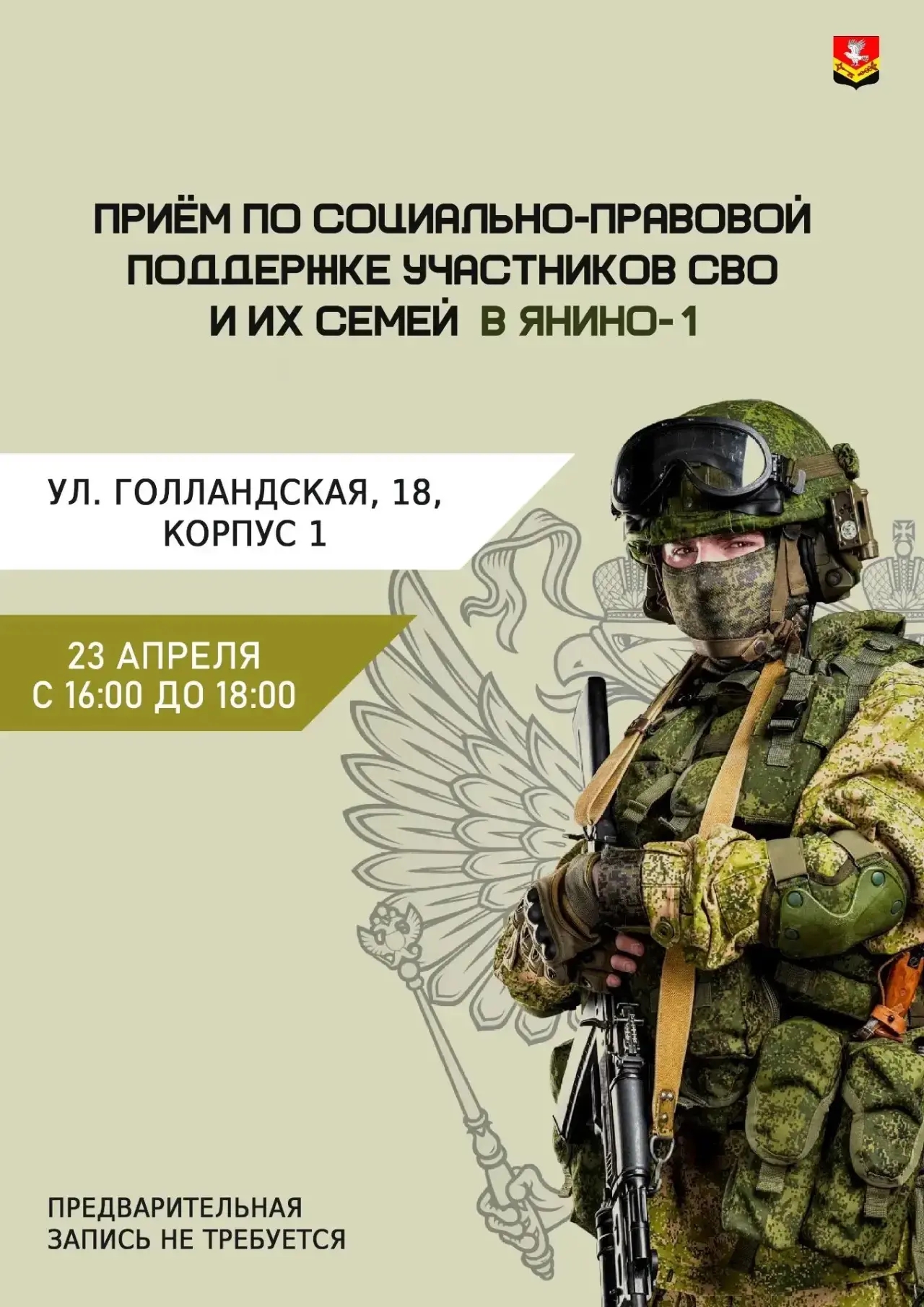 Приём по социально-правовой поддержке участников СВО и их семей состоится в Янино-1