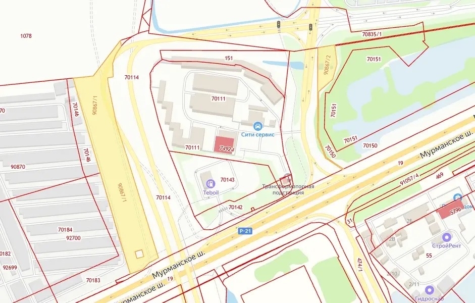 В настоящее время на ничем не огороженной территории участка в зоне первого контура ведутся работы по строительству развязки КАД с Мурманским шоссе. Второй контур участка частично расположен в границах полосы отвода данной автодороги. Здесь размещена только крупноформатная конструкция наружной рекламы.