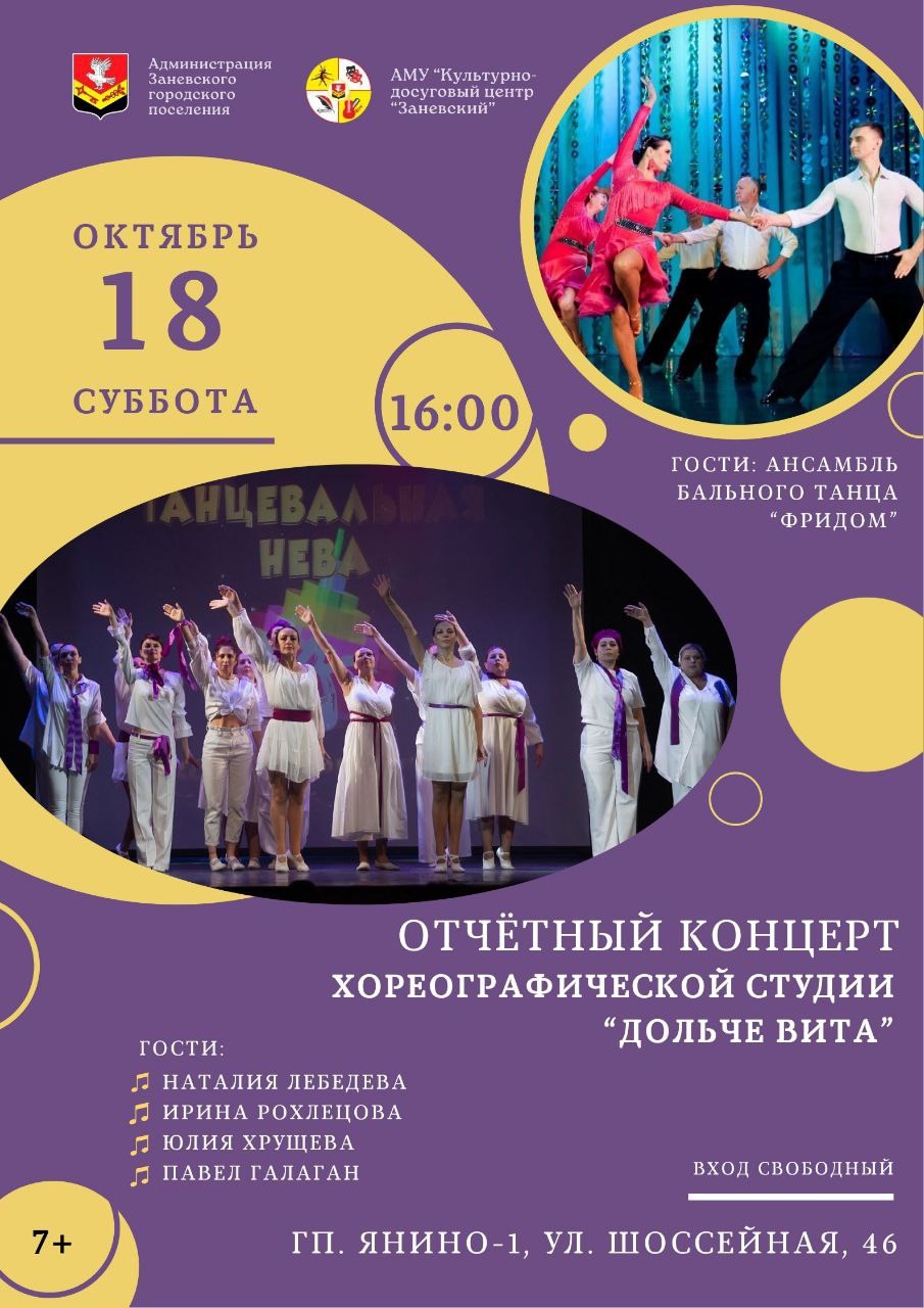 Приглашаем жителей Янино на отчетный концерт хореографической студии «Дольче Вита», который состоится 18 октября в 16:00. Событие пройдет в муниципальном доме культуры Заневского городского поселения.