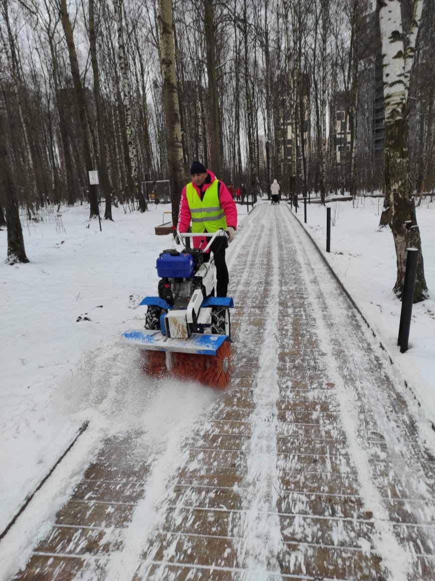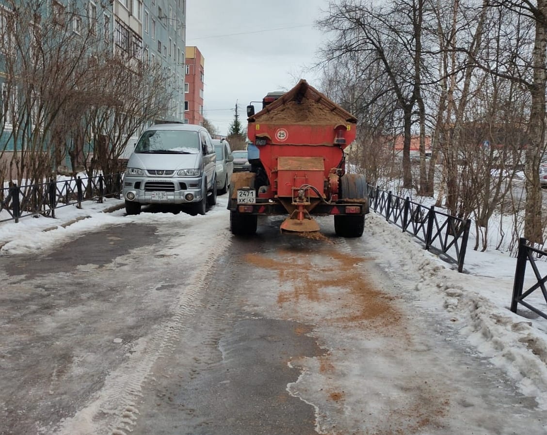 Подрядчик местной администрации не прекращает уборку снега и посыпку дорог и тротуаров песко-соляной смесью. Представляем традиционный фотоотчет ежедневной работы дворников и спецтехники.