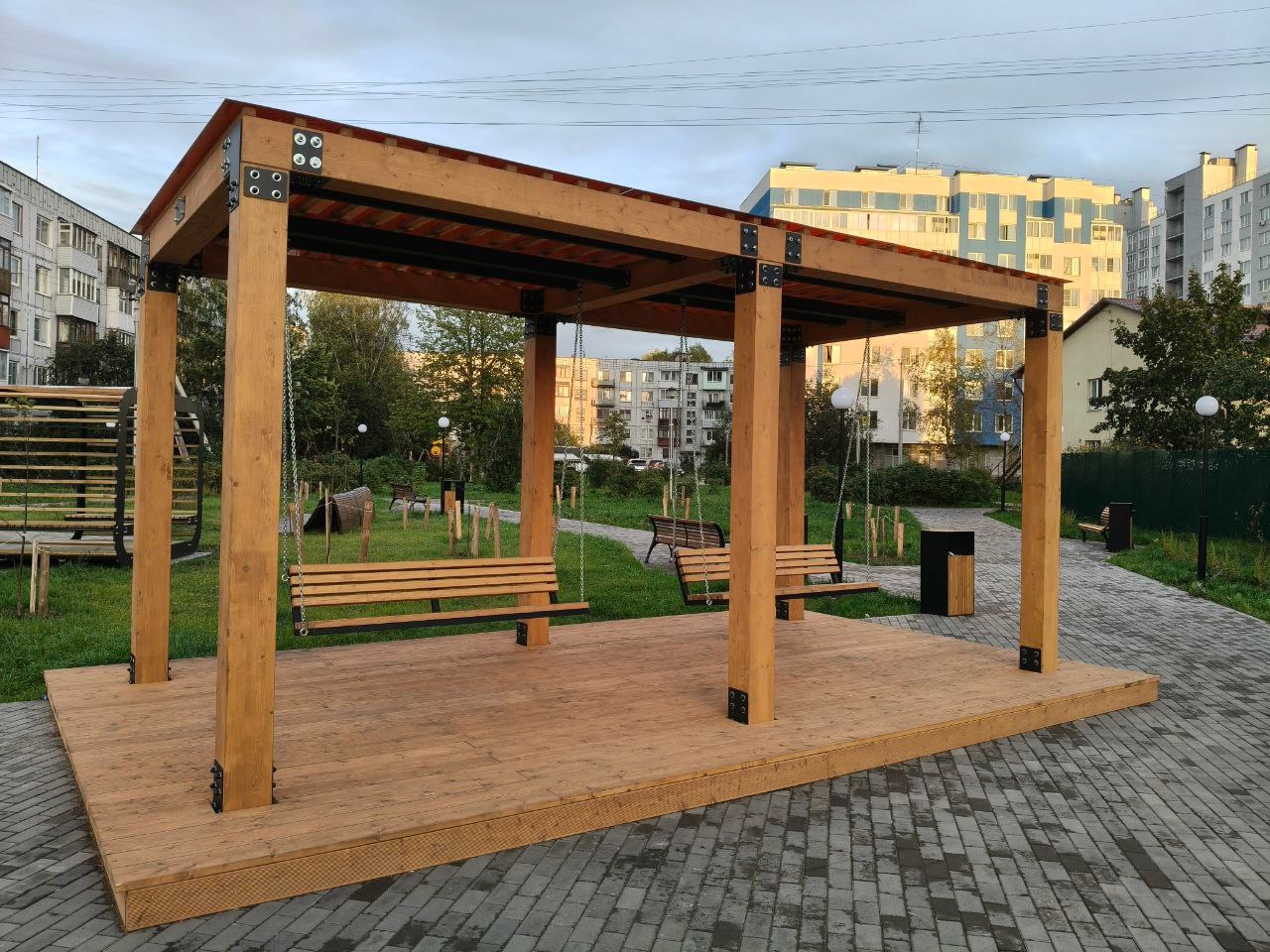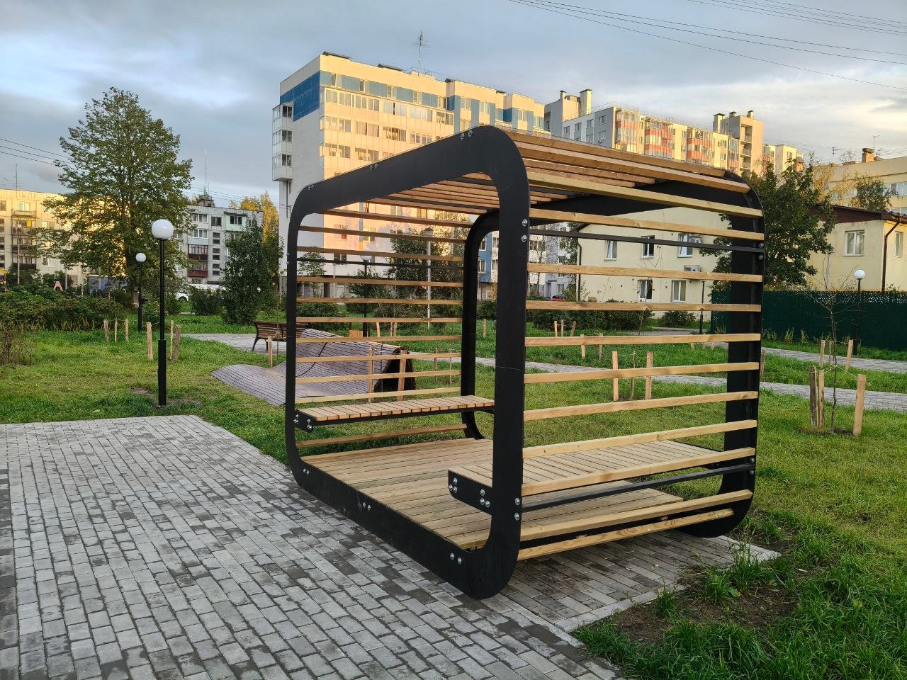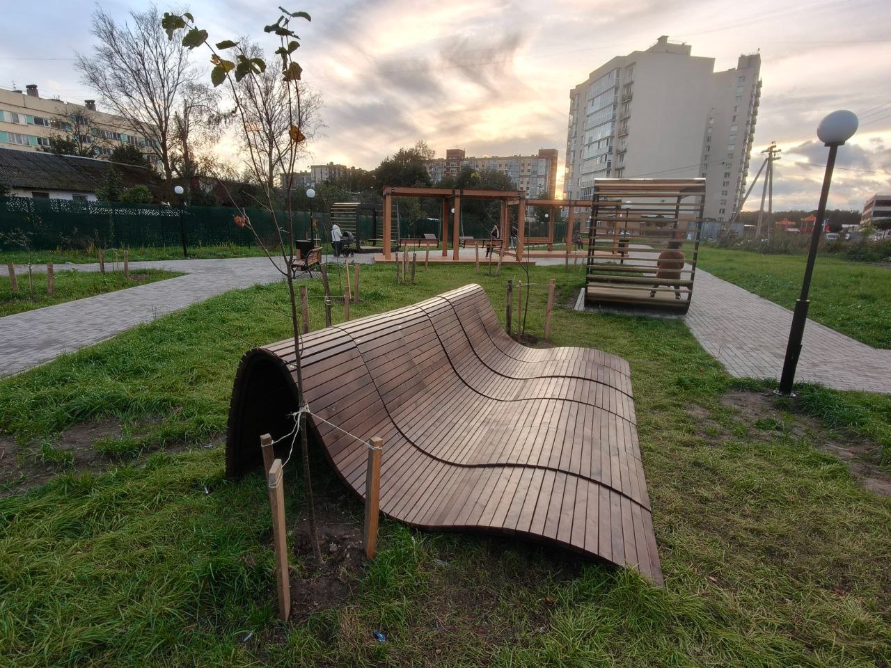 На месте неухоженной тропинки теперь современная прогулочная зона, выложенная брусчаткой. На территории установлены удобные скамейки, урны, два навеса с качелями, парковые лежаки «Волна» и две беседки «Атмосфера». Также проведено озеленение территории липами, яблонями, рябиной и другими цветущими растениями, обустроено почти полторы тысячи квадратных метров газона. Кроме этого, смонтировано 18 фонарей. Освещение появится на объекте, когда будет подведено питание ресурсной организацией. Работа уже ведется.