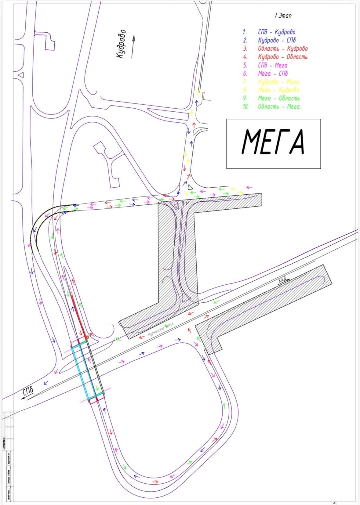 С 12 по 19 мая 2026 года в Кудрово меняется порядок движения транспорта в связи с реконструкцией подъезда к транспортно-пересадочному узлу «Кудрово». Автомобили будут перенаправлены на построенные съезды на Мурманское шоссе в сторону Санкт-Петербурга через улицу Центральную. Существующий въезд в город Кудрово и к ТРЦ «Мега» с трассы «Кола» будет закрыт, там начнется реконструкция еще одного подъезда.