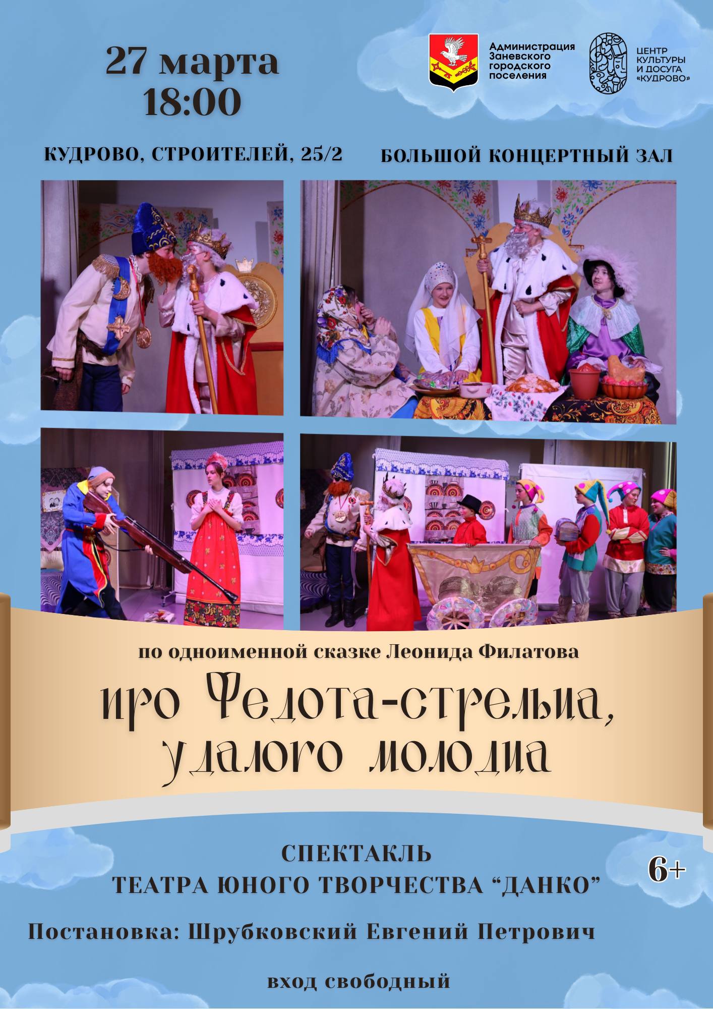 Приглашаем жителей молодого города на спектакль «Про Федота-стрельца, удалого молодца» по одноимённому произведению Леонида Филатова. Постановку представят воспитанники муниципального центра культуры и досуга – артисты театра юного творчества «Данко».