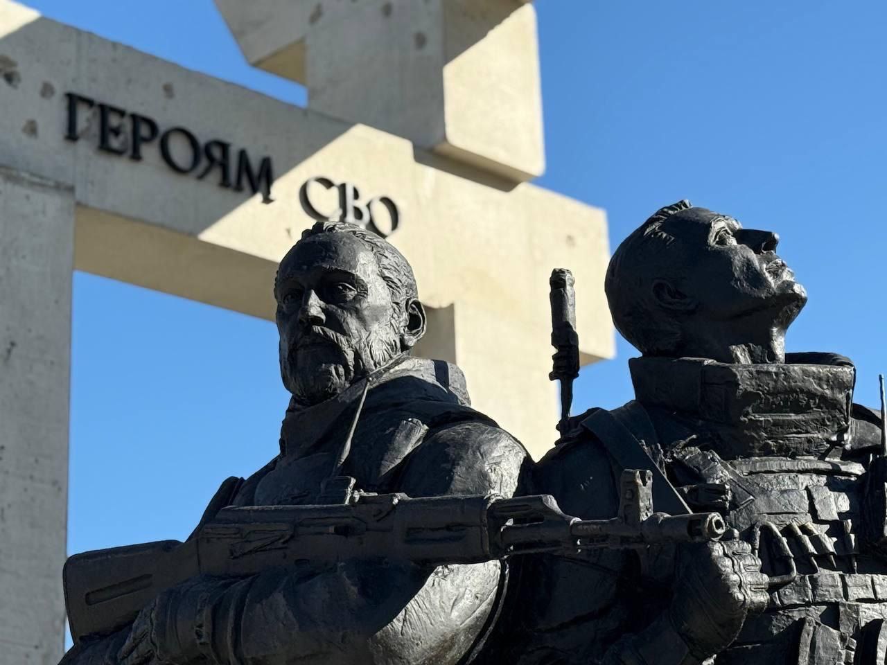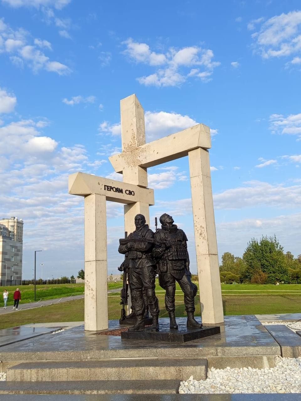 В центре мемориала три бронзовых солдата, символизирующие героев нашего времени. Скульптуры мемориала обладают способностью менять облик в зависимости от ракурса.