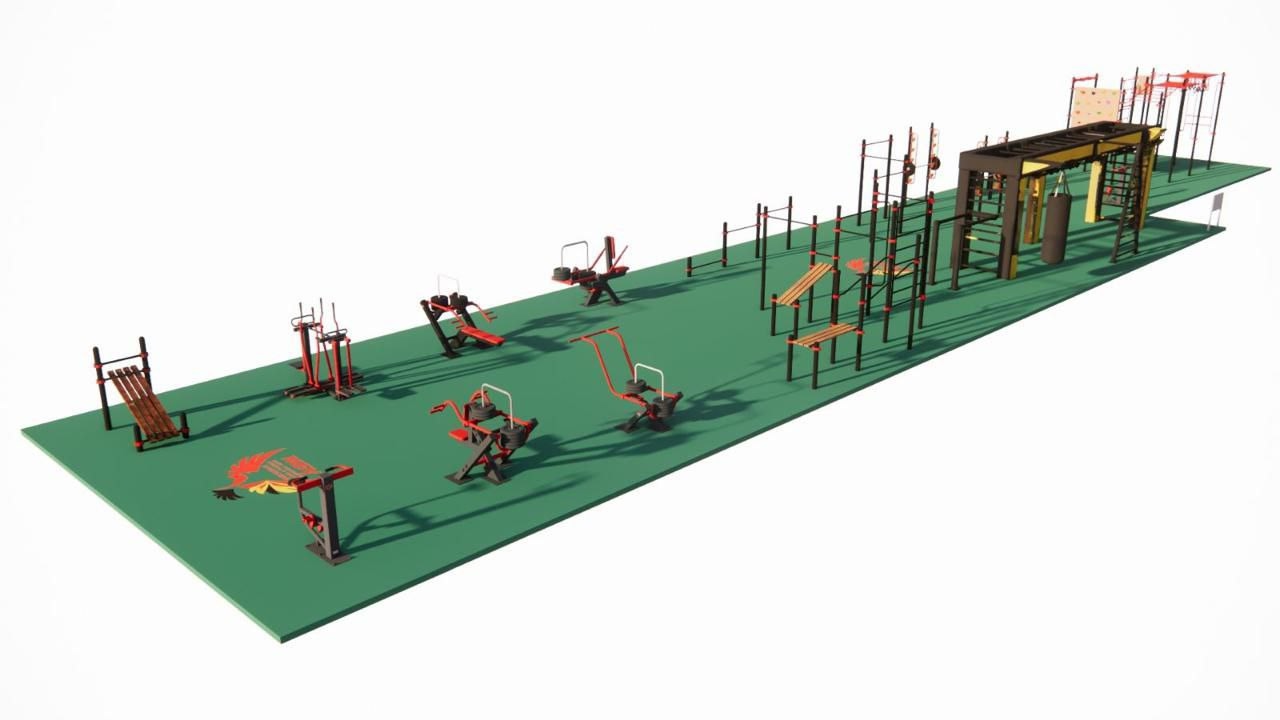В комплекс войдут маятник для укрепления косых и прямых мышц живота, тренажеры для ног «Лыжник», «Хипс» и «Велосипед», а также высокие и низкие перекладины для подтягиваний, скамья для пресса и платформа для отжиманий. Также, по возможности, будет очерчена специальная линейка для прыжков в длину с места.
